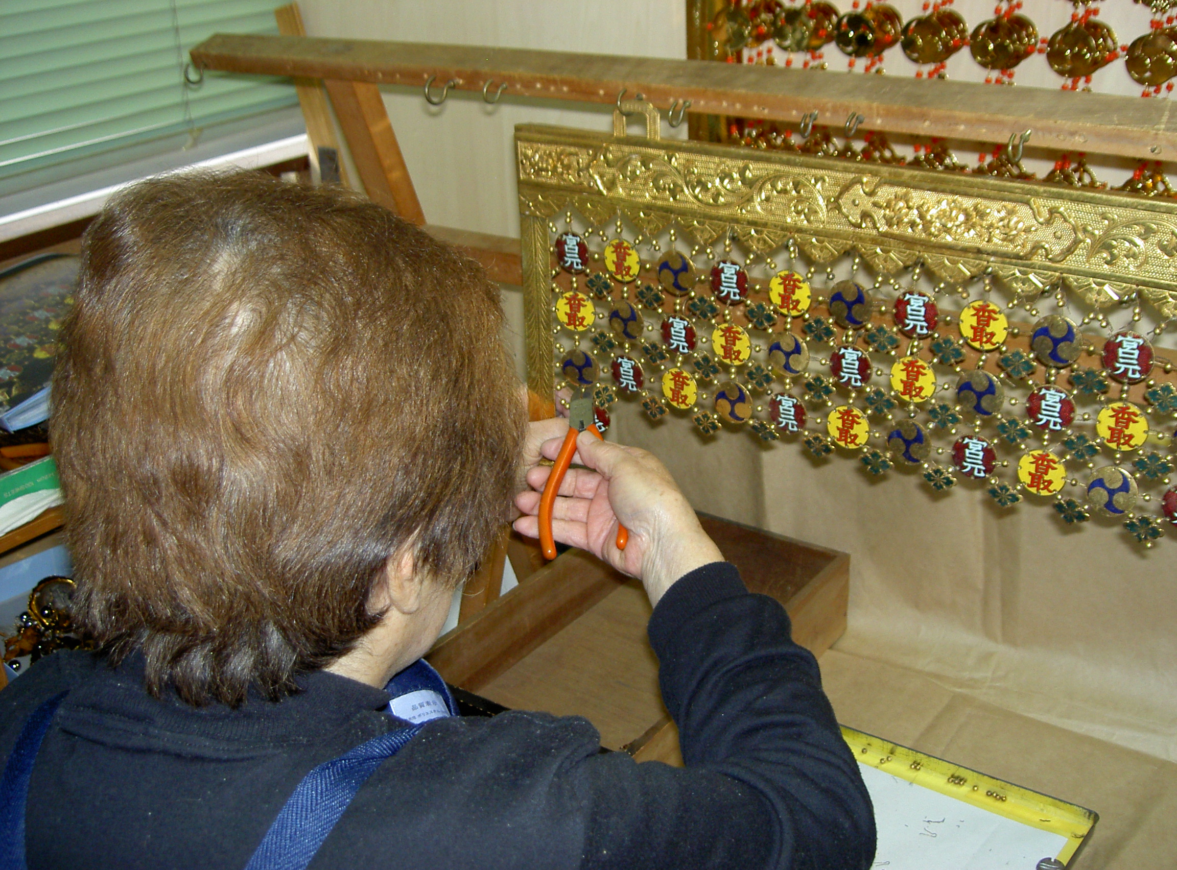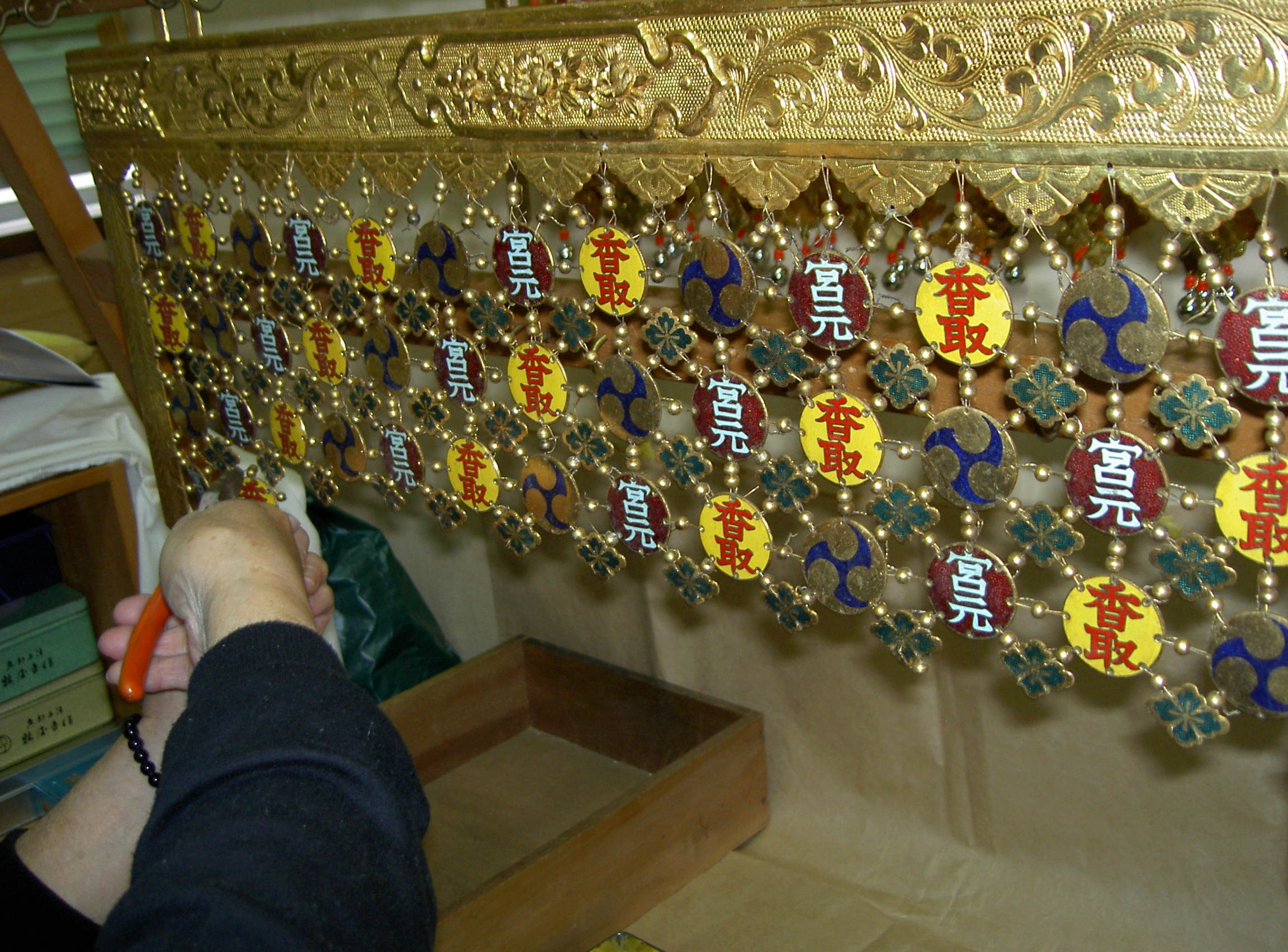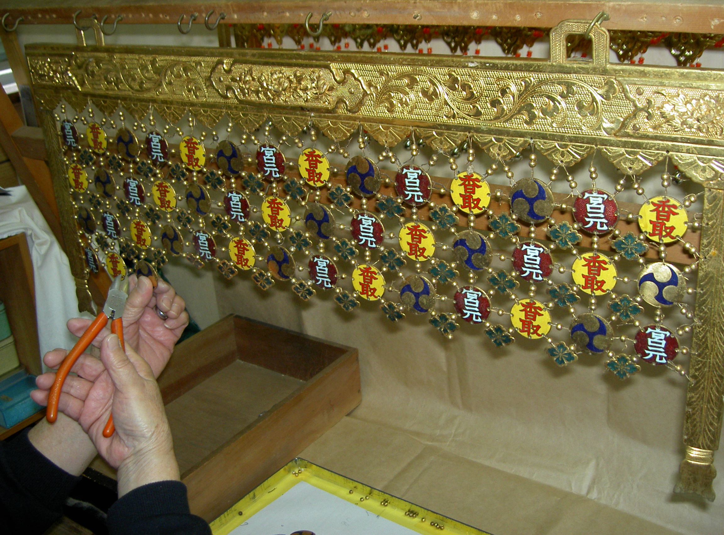 瓔珞を修復する為、繋いでいる針金を切り巴紋、花菱、真鍮玉等をバラシます。